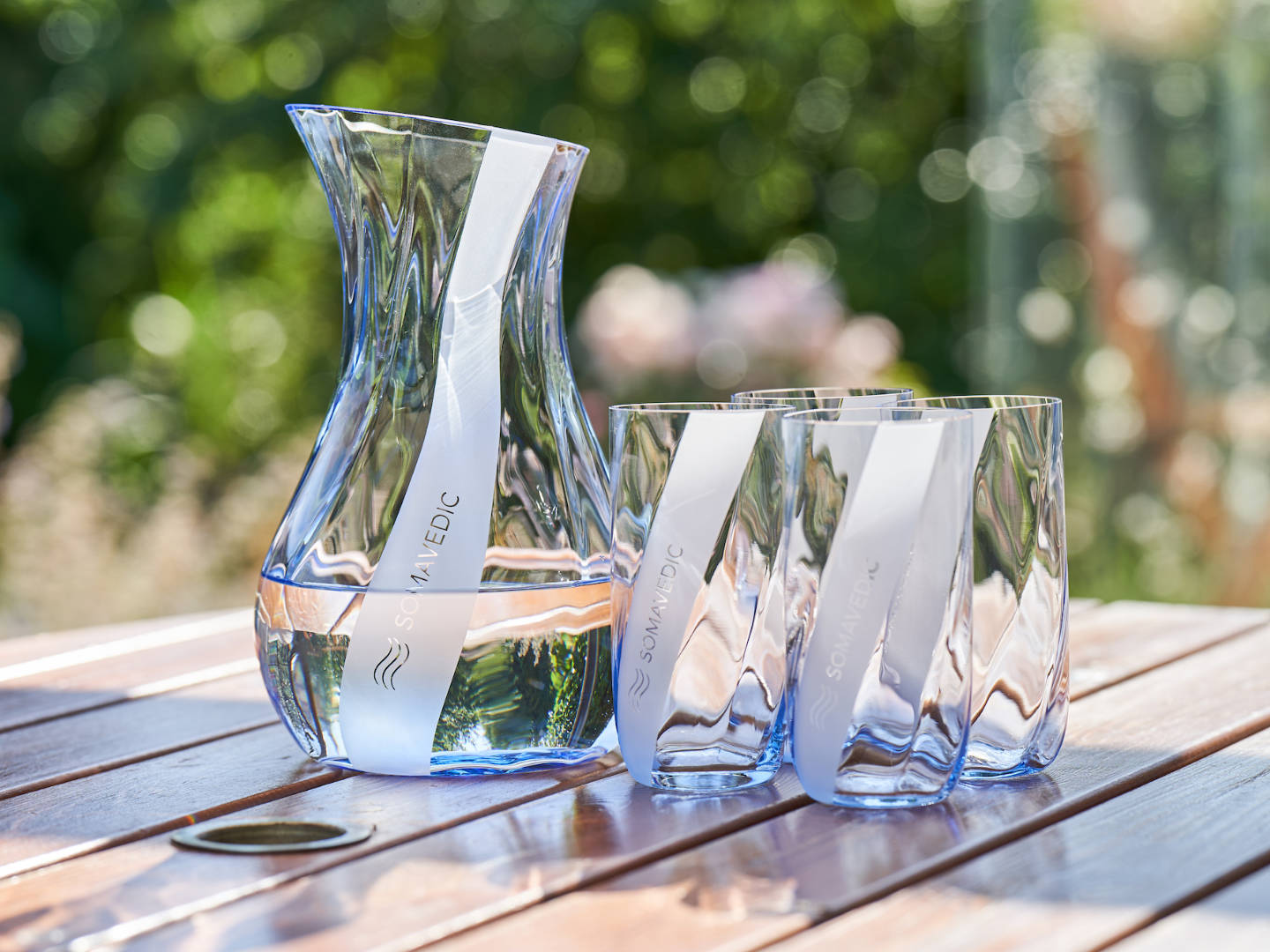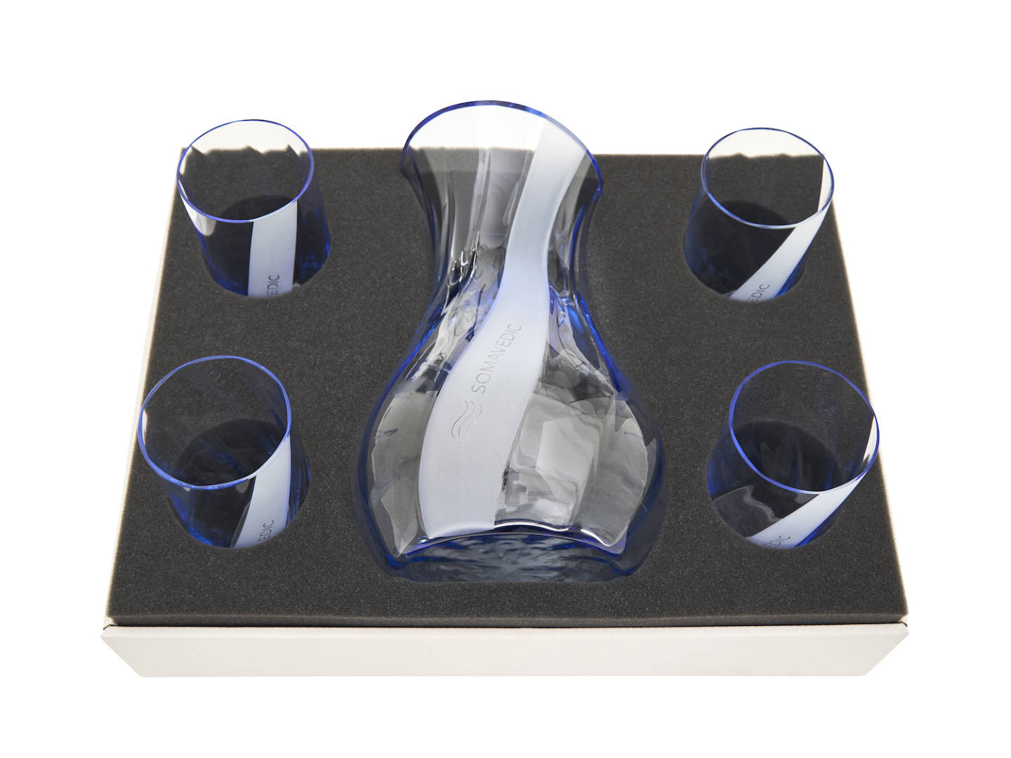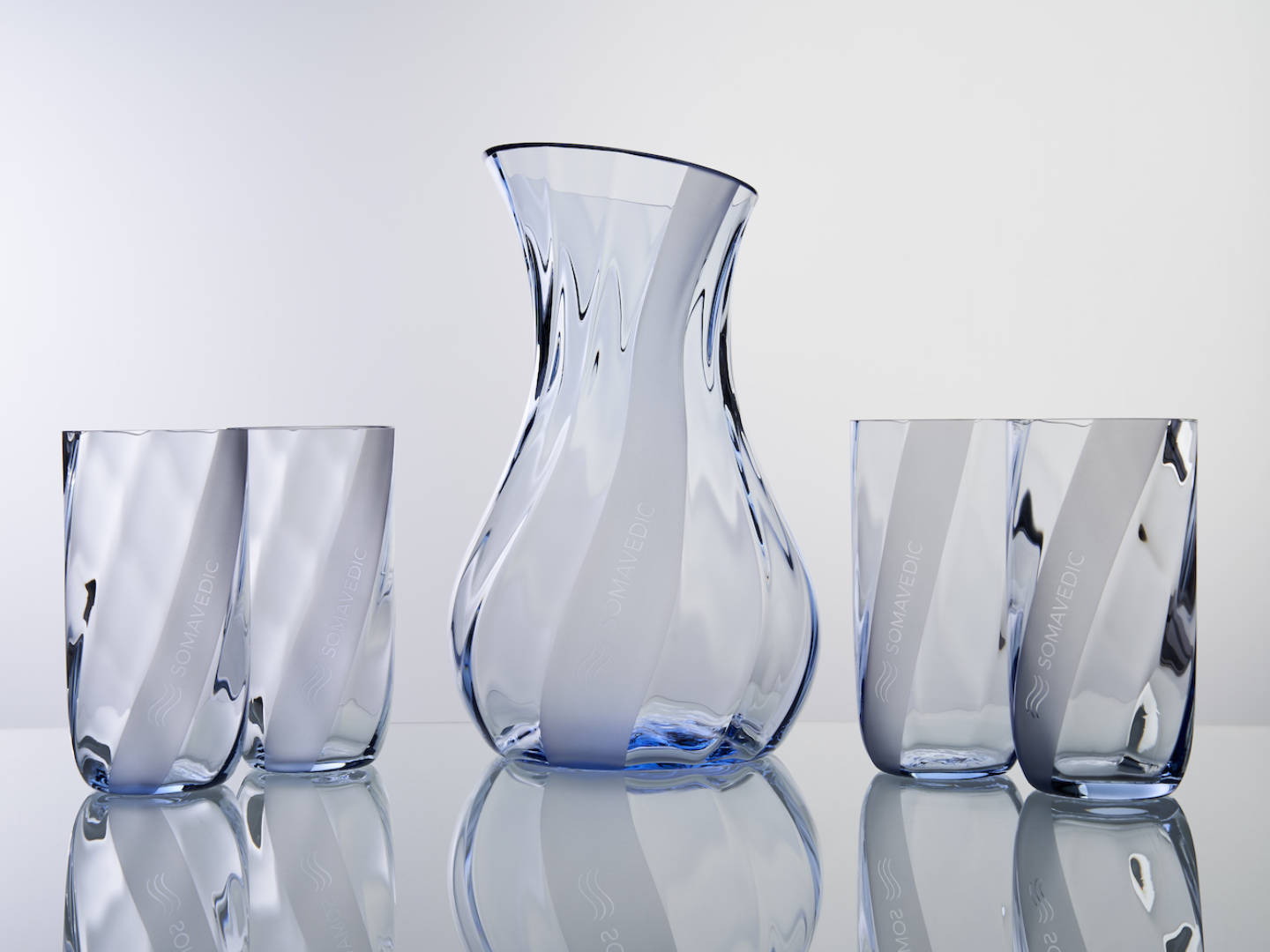 Luxury set of a carafe and 4 glasses made of cobalt glass. A stylish accessory for your table and everyday hydration routine. Ideal for water harmonized by your Somavedic.
